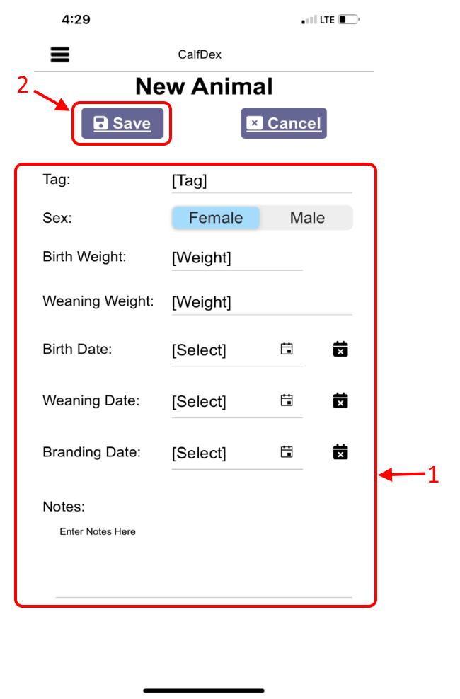 Clicking "Add" from the "My Herds" screen displays the "New Animal" page. Enter any desired information and press "Save"