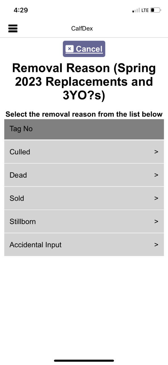 Select"Remove" displays a list with options for the reason why the animal is being removed from the herd. Select an animal you'd like to remove, then enter a removal reason. Press "Confirm"